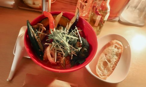 カレー2月22日でオープン9周年を迎える『トムトムキキル』のSNS告知を見ると、カレーの具材としては珍しい「ソーキのスープカレー」を提供していると言うので、鶏天サービスの葉書クーポンを握り締めて入店です。 2月1日から夜営業を…