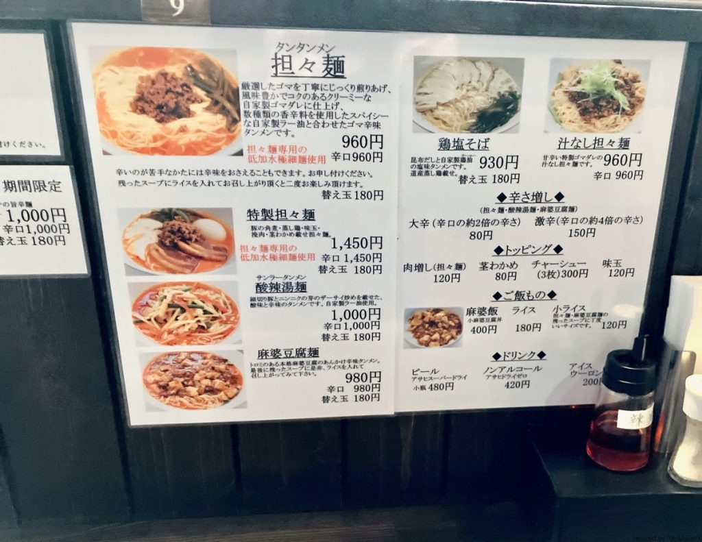 ◾️麺類のメインは四川系の担々麺・酸辣湯麺・麻婆豆腐麺で、アッサリ系の鶏塩そばもある