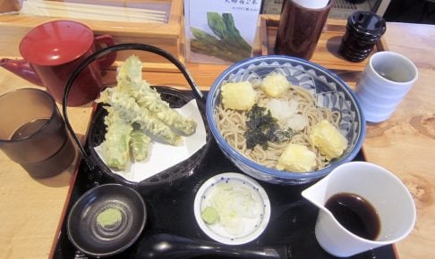 蕎麦昨年初めて訪問した時は、百貨店催事へ出店との事で食べる事が出来ず、今回はリベンジです。11時30分に一番乗りで入店。食べるものは決めていて「やまべ天もりそば」へニラをトッピングで、店のおねーさんに「ニラはまだ柔らかいです…